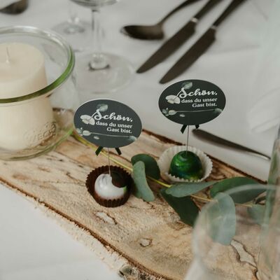 Ganz egal, wo eure Location liegt, mit eurer Dekoration wird sie noch schöner, cooler oder ausgefallener. Begrüßt eure Gäste doch mit einem Willkommens-RollUp oder einem -Banner und unterstützt sie mit einem Gäste-Sitzplan, Tischkarten und Namenskärtchen bei der Sitzplatzwahl und dem gemeinsamen Kennenlernen. Mit Gastgeschenken, Aufklebern und Getränkedosen tragen sie die Erinnerung an diesen großen Tag noch lange mit sich.